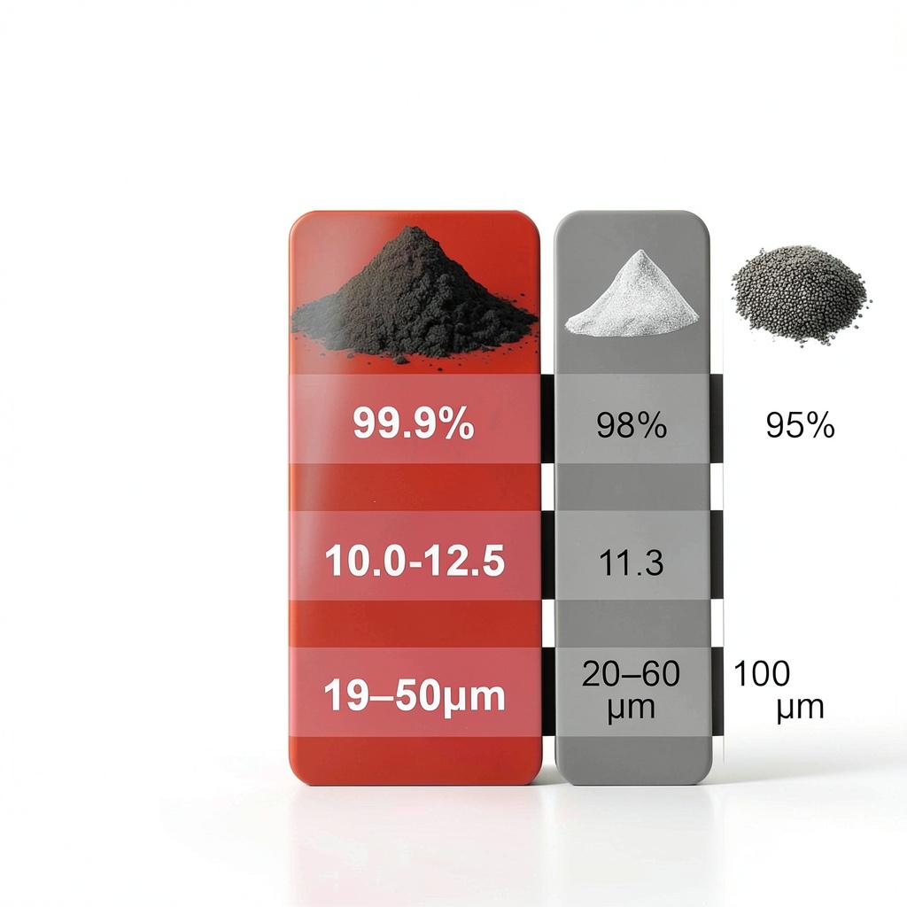 The powder has a purity of over 99.9%, with minimal impurities like less than 0.020% Carbon and 0.350% Oxygen, ensuring high-quality results.